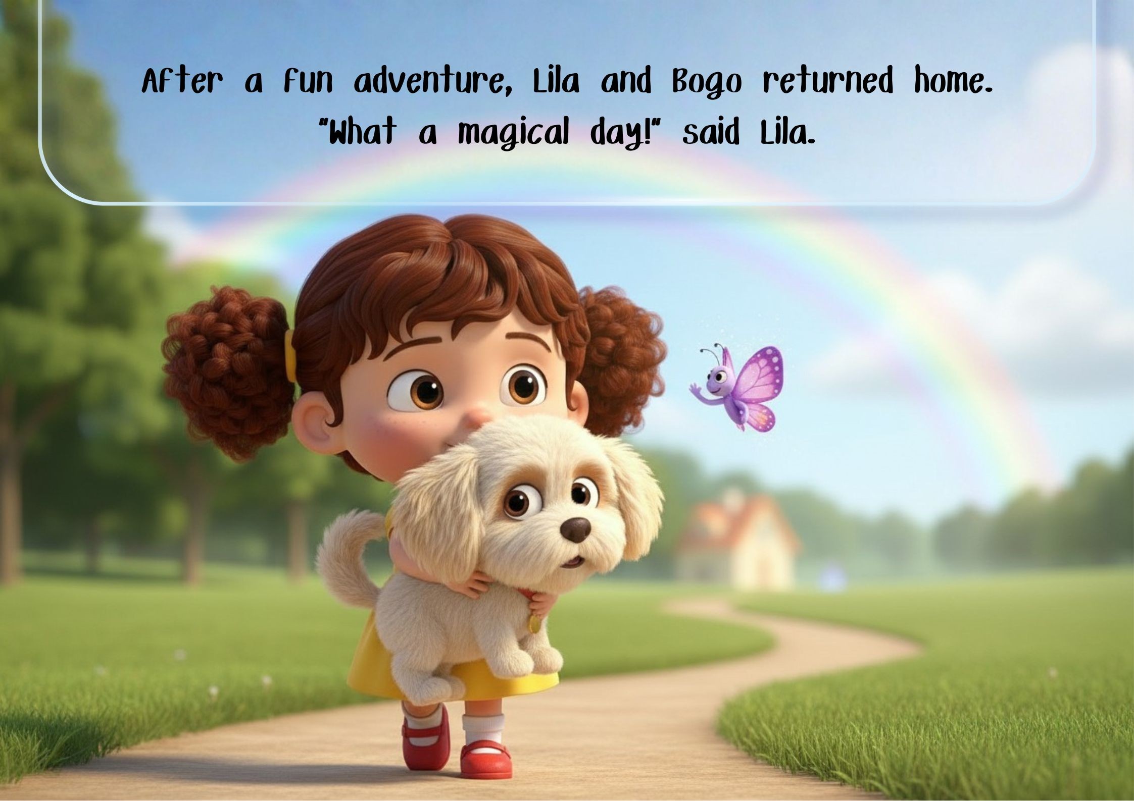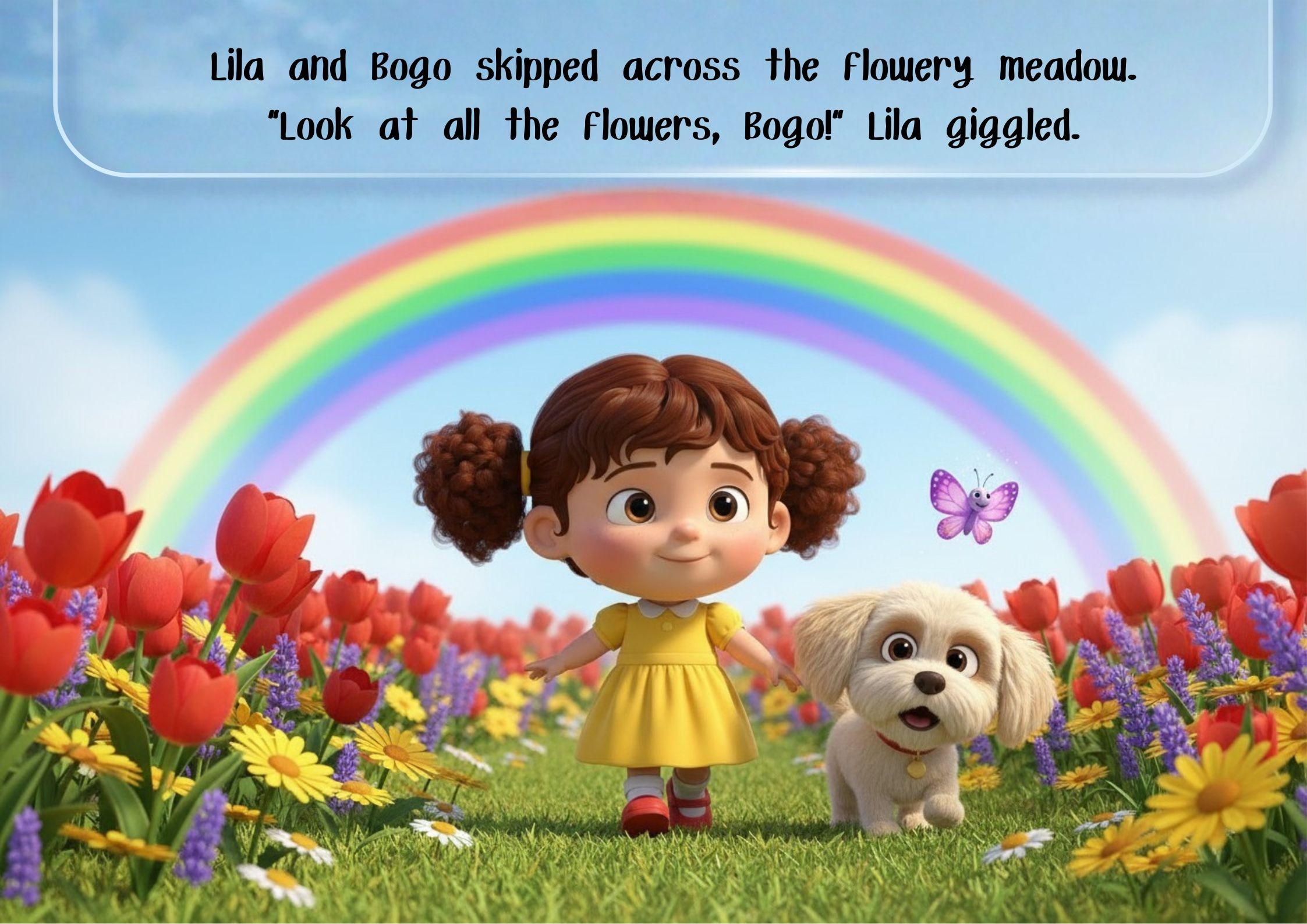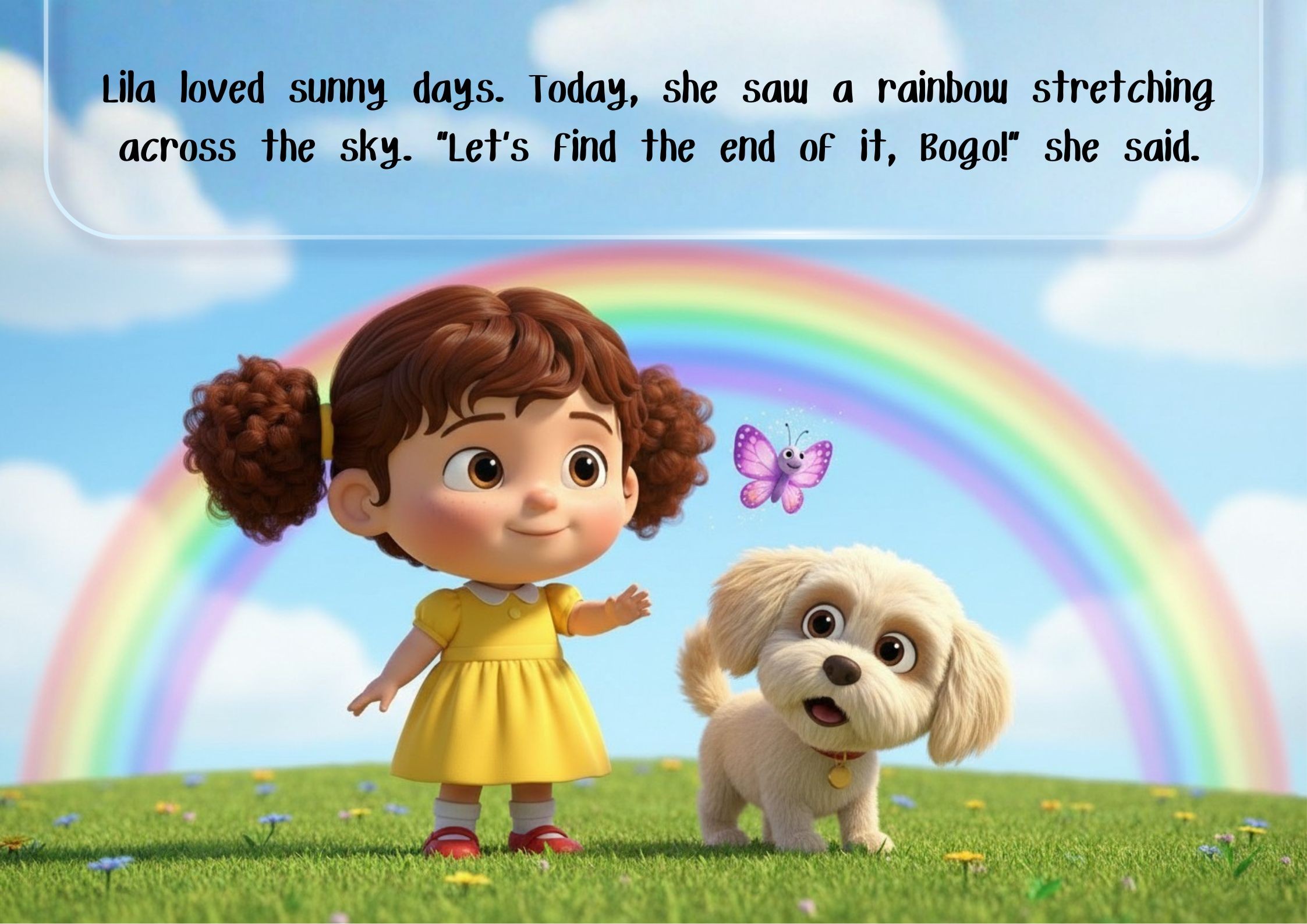In a bright, whimsical landscape, a cheerful child in a simple dress pointed excitedly