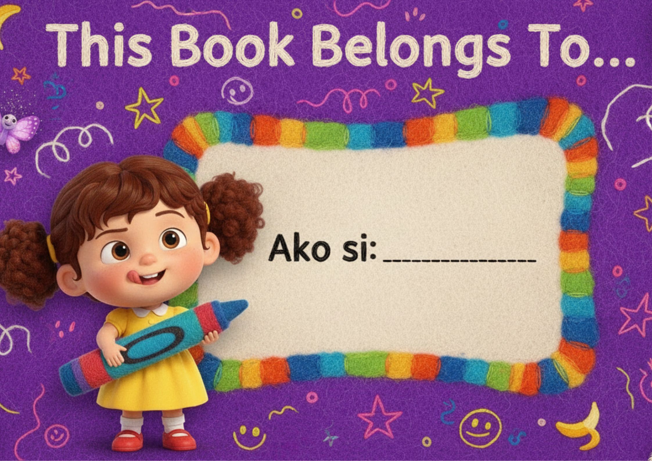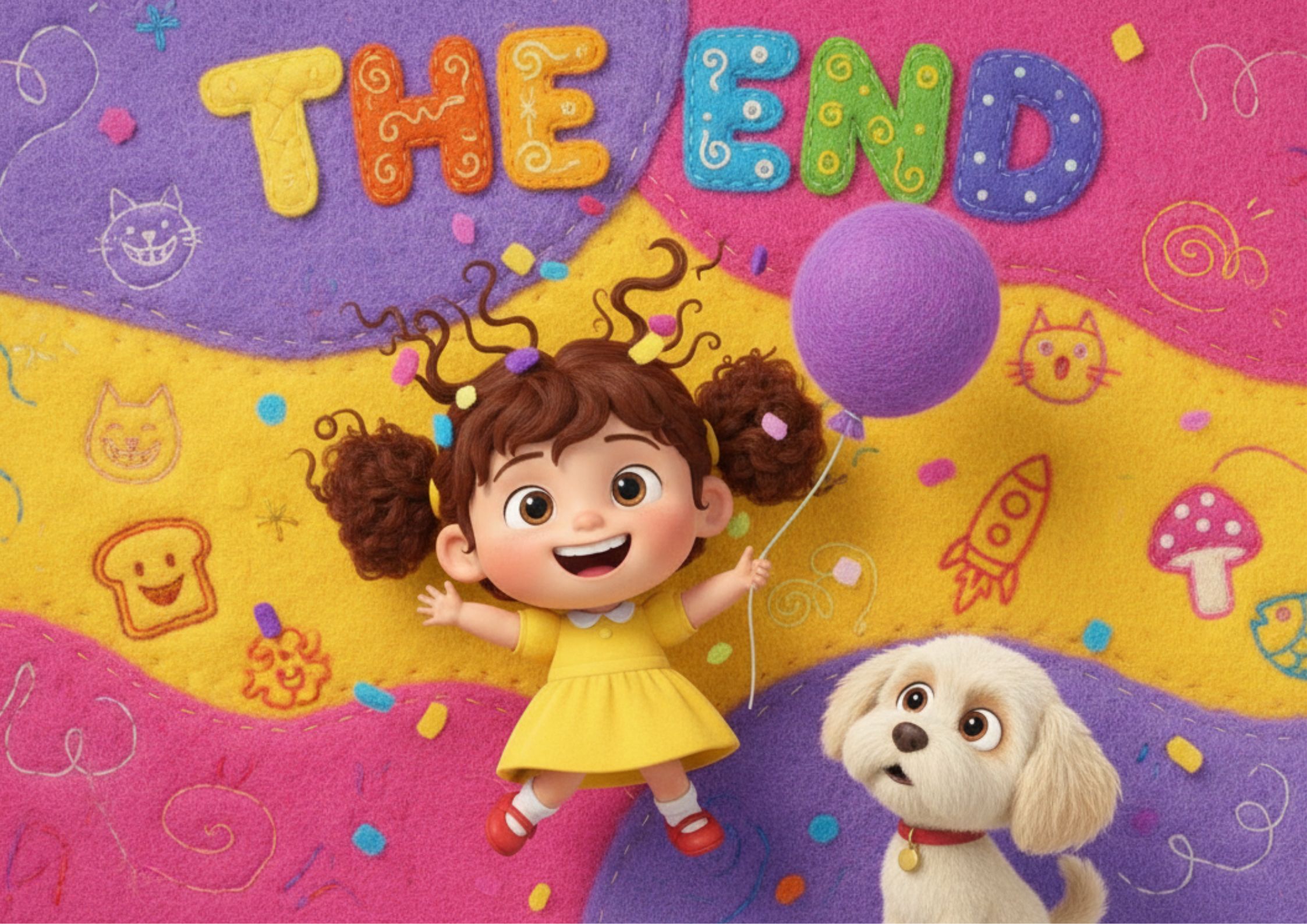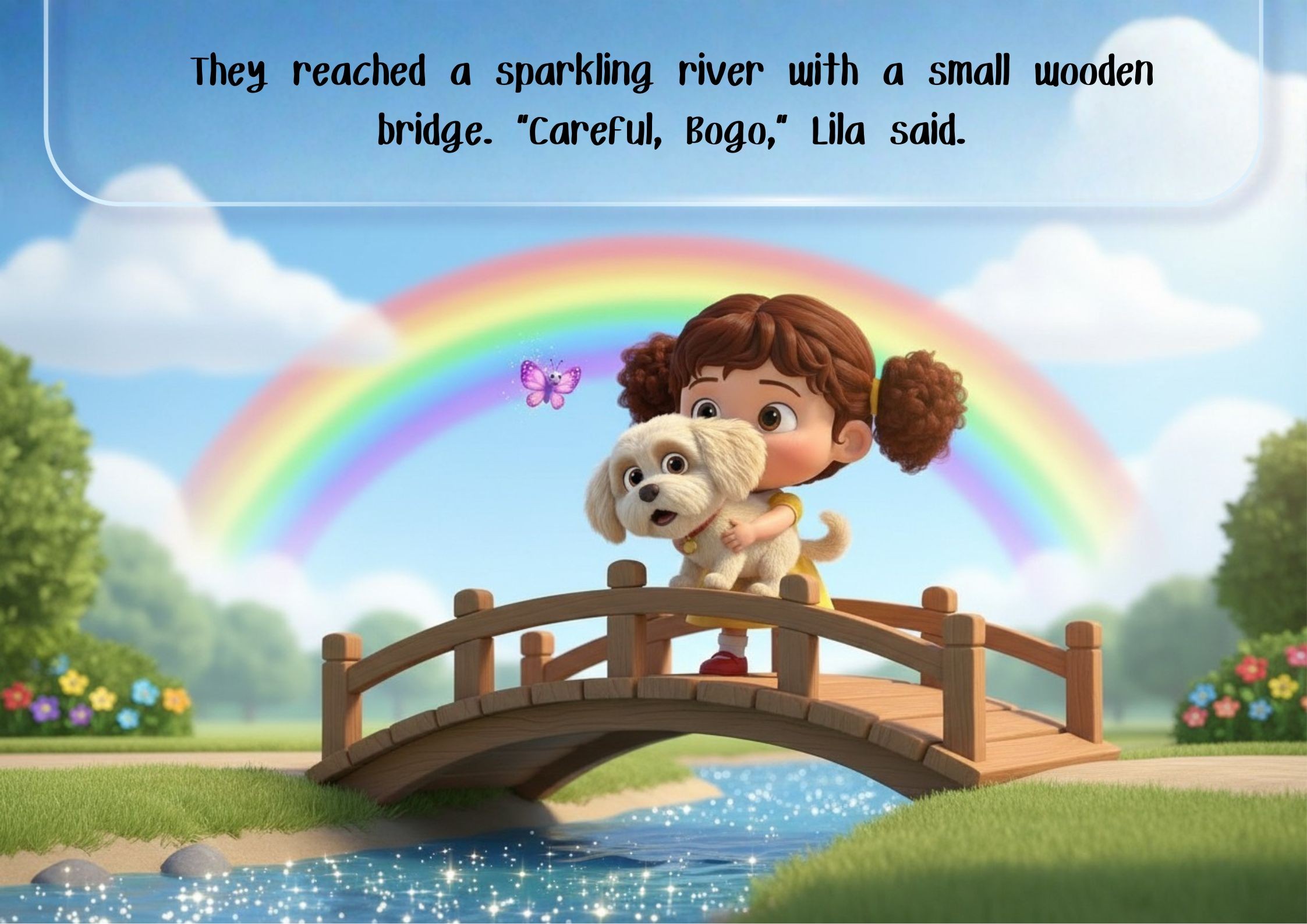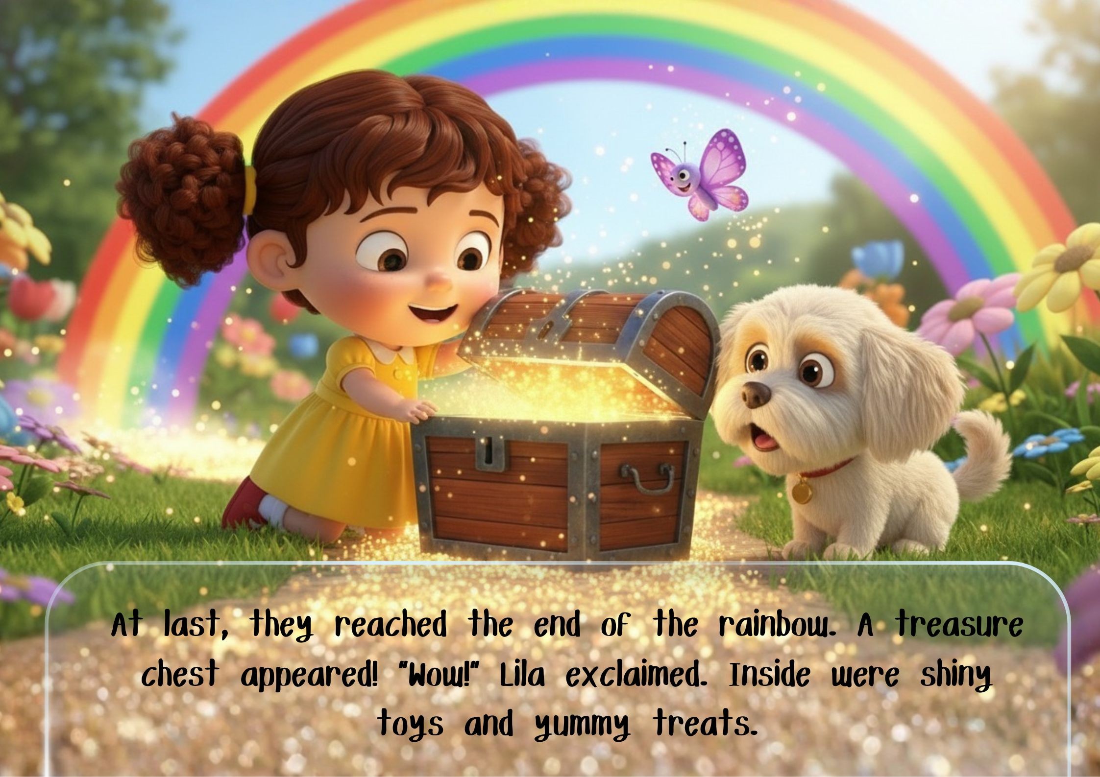 In a bright, whimsical landscape, a cheerful child in a simple dress pointed excitedly